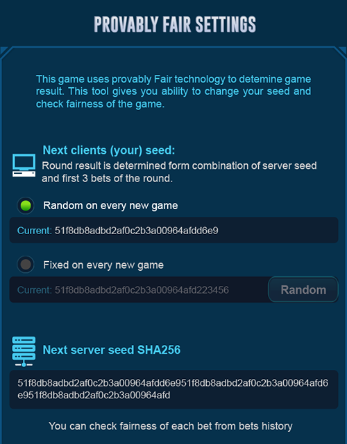 • To prove fairness, we will show the client seed and the random number before each round, so players can change their client seeds if they want.